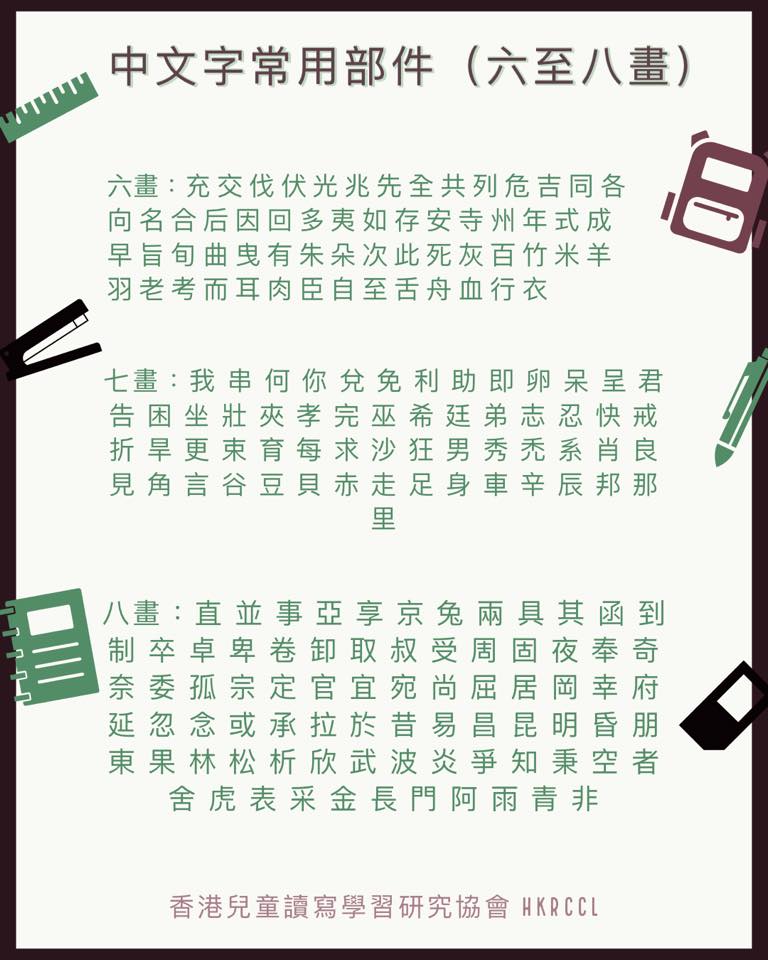 有了200個漢字的基礎,可以教孩子拆部件,學部首。 部件包含部首,除了部首外,還有很多常用的部件需要學習。 了解同一個部首表示同樣的詞族,漢字是意音文字,部首表示意思,非部首表示聲音(形聲字中約4成成功率) 認識了這些部件,之後學組合字會變得輕鬆。